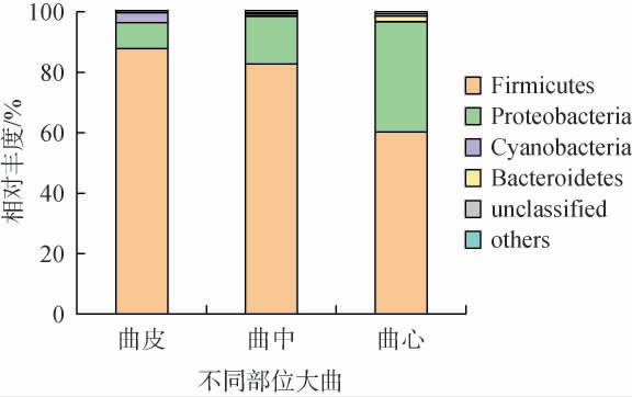 基于门分类学水平,将相对丰度<1%的门归为一类,即others,将没有明确的分类信息的归为unclassified。由图1可知,不同部位浓香型大曲样品中的优势细菌门包括厚壁 菌 门(Firmicutes)、变 形 菌 门(Proteobacteria)、蓝 藻 门(Cyanobacteria)、拟杆菌门(Bacteroidetes),其中厚壁菌门是绝对的优势物种,相对丰度高达60.2%~87.8%,且在曲块不同部位中占比呈曲皮>曲中>曲心的趋势。另一类优势菌变形菌门在曲样中的相对丰度为8.5%~36.4%。此外,蓝藻门主要在曲皮中累积,相对丰度达3.32%,但在曲中和曲心内相对丰度较低,尤其在曲心的相对丰度仅0.13%;而拟杆菌门与蓝藻门相反,其在曲心中相对丰度为1.9%,且由内向外丰度依次降低,在曲皮的丰度仅0.12%。厚壁菌门和变形菌门成为大曲主要优势菌,原因是大曲水分含量较低,无法满足多数微生物的生长,而厚壁菌门类的微生物大多可产生芽孢,对恶劣环境具有较强的耐受性[18],变形菌门类微生物的遗传多样性极为丰富,涵盖了极为广泛的生理代谢类型,因此面对不同的环境能及时做出有利于自身生长的调节。