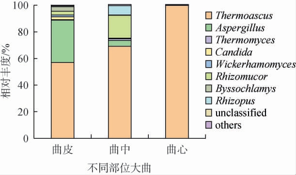 通过分析真菌属的分布,发现优势菌属种类数量曲皮>曲中>曲心,曲皮部位以Thermoascus、Aspergillus为主(二者占比88.7%),Candida、Rhizomucor、Byssochlamys、Wickerhamomyces呈均匀 分布,其中Candida、Byssochlamys、Wickerhamomyces仅在曲皮中为优势菌。 曲中部位优势菌属以Thermoascus、Rhizomucor为主(二者占比86.3%),且还包含Rhizopus、Aspergillus、Thermomyces三类优势菌,其中Rhizopus、Thermomyces仅为曲中的优势菌。而曲心的物种比较单一,Thermoascus占99.8%。 造成此现象的原因可能为在制曲过程中,曲块表层更易密集到环境微生物,同时真菌一般需要氧气才能生长繁殖,而曲块表层接触空气多,越到内部氧气越少,限制了真菌的生长,因此真菌多样性曲皮>曲中>曲心。