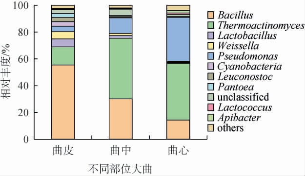 综 合 分 析 发 现,Bacillus、Thermoactinomyces和Pseudomonas不同部位浓香型大曲样品中均占主导地位,三者比例之和分别占曲皮、曲中和曲心的73.1%、87%、89.6%。Bacillus、Weissella、Lactobacillus、Cyanobacteria、Leuconostoc、Pantoea均呈曲皮>曲中>曲心的规律,但Pseudomonas、Lactococcus、Apibacter呈相反趋势,其中Pseudomonas在曲心相对丰度高达32.9%。Thermoactinomyces在曲中和曲心的相对丰度达42%以上,但在曲皮相对丰度仅有13.6%,这是由于Thermoactinomyces是对温度具有极高的该耐受力,能产生气生菌丝和孢子,通常能在45~60 ℃的温度下繁殖[19-20]。通过分析细菌属的分布,发现虽然曲心和曲中的物种数量高于曲皮,但集中为Bacillus、Thermoactinomyces和Pseudomonas三类物种,其他较多的种群丰度较低,归入了others,而曲皮中各类优势菌的分布更加均匀,这与表1 中细菌Alpha多样性的分析结果一致。