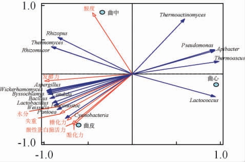 由图5可知,物种信息与理化指标关系能被100%解释,其中第一轴能解释84.17%的变异信息,第二轴能解释15.83%的变异信息。Thermoactinomyces、Pseudomonas、Apibacter、Lactococcus、Thermoascus之间呈正相关且主要指向曲心;酶活(酸性蛋白酶、糖化力、酯化力)和发酵能力指标(发酵力、质量损失)与Aspergillus、Byssochlamys、Candida、Wickerhamomyces、Bacillus、Weissella、Lactobacillus、Cyanobacteria、Leuconostoc、Acetobacter之间呈高度正相关且主要指向曲皮;而Rhizomucor、Rhizopus、Thermomyces、Thermoactinomyces、Aspergillus、Byssochlamys与酸度之间呈正相关且主要指向曲中部位。 总体来看,影响曲皮的微生物种类更多,其次是曲中,而曲心微生物种类相较单一,微生物的差异会直接影响不同部位大曲的酿造特性。