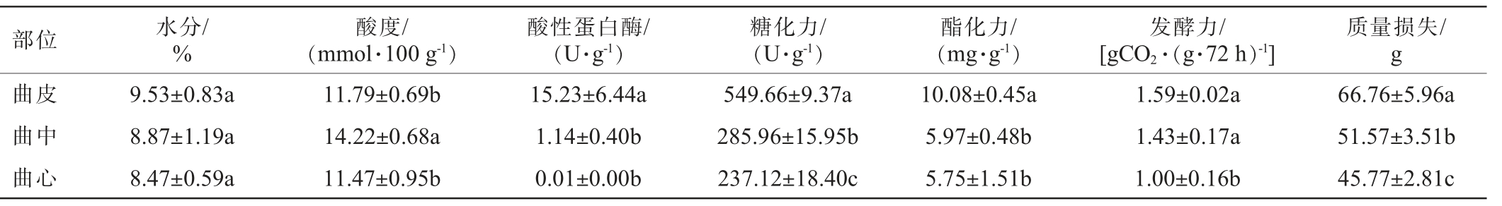 部位 水分/%酸度/(mmol·100 g-1)酸性蛋白酶/(U·g-1)糖化力/(U·g-1)酯化力/(mg·g-1)发酵力/[gCO2·(g·72 h)-1]质量损失/g曲皮曲中曲心66.76±5.96a 51.57±3.51b 45.77±2.81c 9.53±0.83a 8.87±1.19a 8.47±0.59a 11.79±0.69b 14.22±0.68a 11.47±0.95b 15.23±6.44a 1.14±0.40b 0.01±0.00b 549.66±9.37a 285.96±15.95b 237.12±18.40c 10.08±0.45a 5.97±0.48b 5.75±1.51b 1.59±0.02a 1.43±0.17a 1.00±0.16b