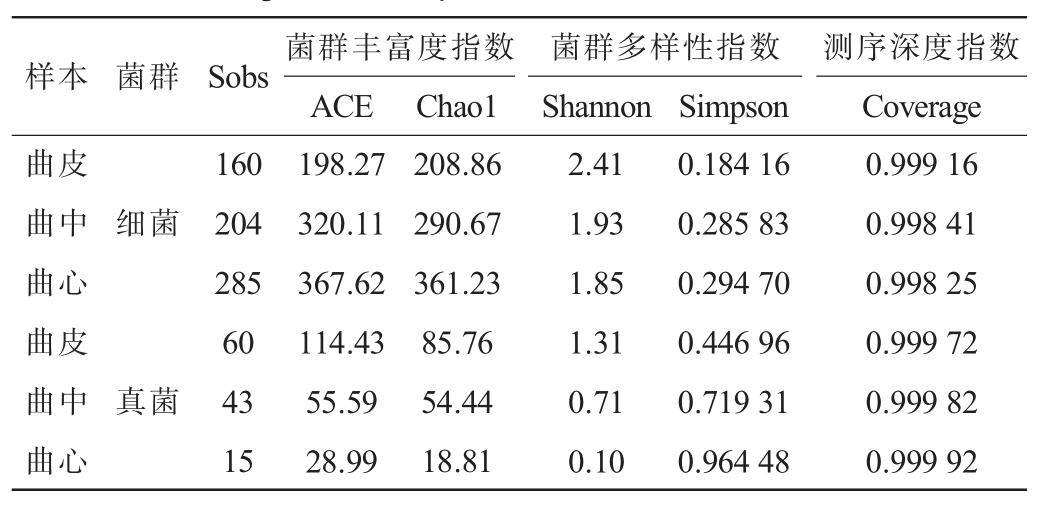表2 不同部位浓香型大曲微生物Alpha多样性指数
