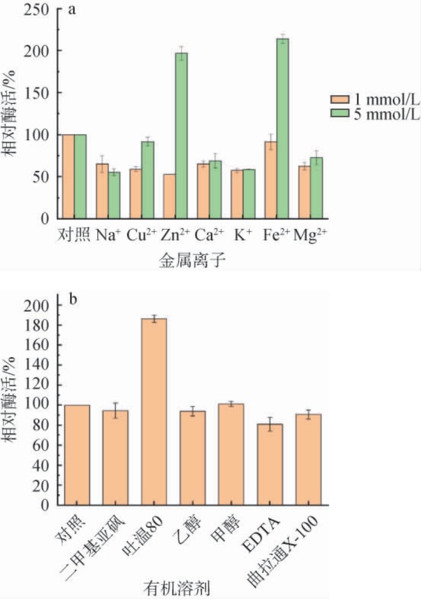 图4 金属离子(a)及有机溶剂(b)对重组普鲁兰酶Pul-K25酶活的影响