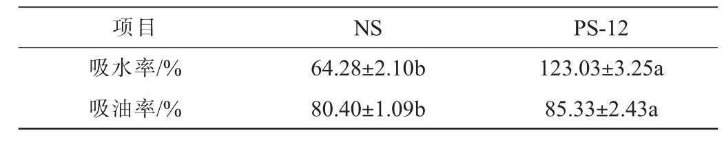 项目 NS PS-12吸水率/%吸油率/%64.28±2.10b 80.40±1.09b 123.03±3.25a 85.33±2.43a