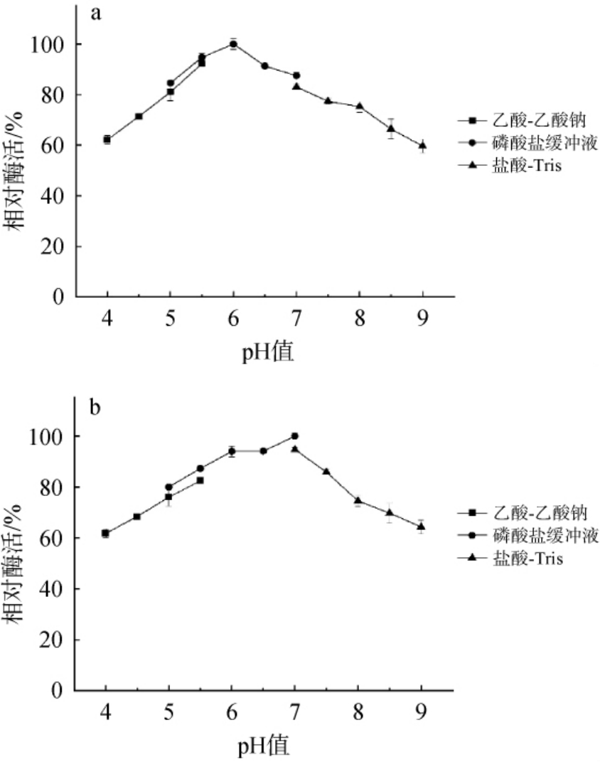 最适作用pH:将酶液分别在pH 4.0~9.0条件下测定酶活性。选择3种缓冲液(覆盖pH 4.0~9.0的范围,大多数淀粉酶的最适pH通常在5.5~7.0,而某些耐酸酶可能在pH 4.5~5.5仍有活性,确保不遗漏酶的潜在最适pH区间),分别为50 mmol/L乙酸-乙酸钠缓冲液(pH 4.0~6.0)、50 mmol/L磷酸盐缓冲液(pH 5.0~7.0)和50 mmol/L盐酸-Tris缓冲液(pH 7.0~9.0)。以最高酶活为100%,计算其他pH条件的相对酶活。