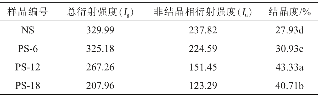样品编号 总衍射强度(Ig) 非结晶相衍射强度(In) 结晶度/%NS PS-6 PS-12 PS-18 27.93d 30.93c 43.33a 40.71b 329.99 325.18 267.26 207.96 237.82 224.59 151.45 123.29