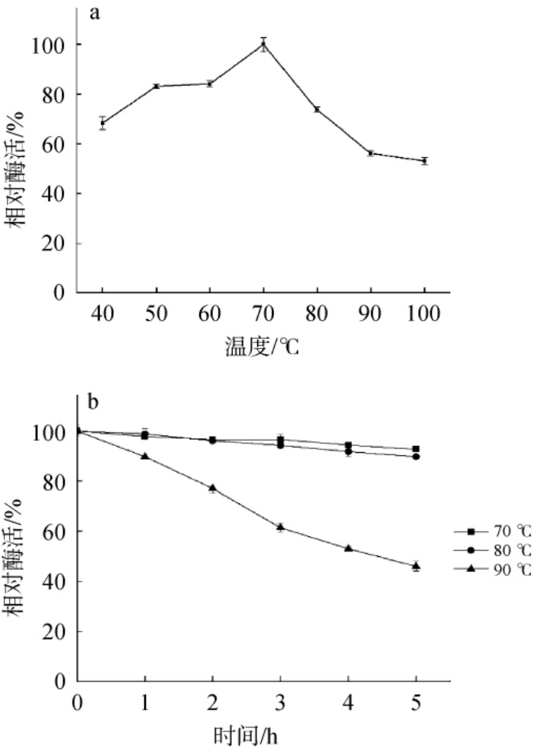 温度稳定性:将酶液分别在70 ℃、80 ℃和90 ℃条件下进行保温处理放置5 h,每1 h取样测定酶的残余酶活,以最高酶活为100%,计算其他温度条件的相对酶活。