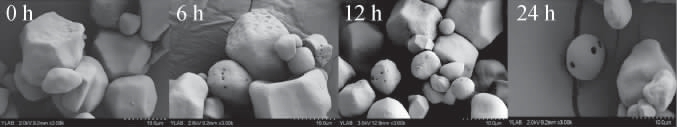 Fig.5 Scanning electron microscope of porous lotus seed starch granules with different treatment time of recombinant pullulanase Pul-K25