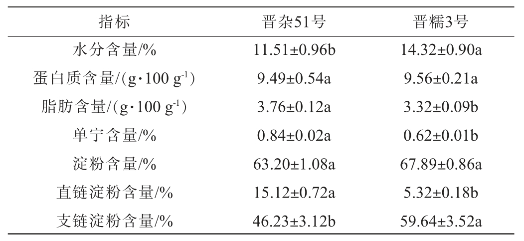 指标 晋杂51号 晋糯3号水分含量/%蛋白质含量/(g·100 g-1)脂肪含量/(g·100 g-1)单宁含量/%淀粉含量/%直链淀粉含量/%支链淀粉含量/%14.32±0.90a 9.56±0.21a 3.32±0.09b 0.62±0.01b 67.89±0.86a 5.32±0.18b 59.64±3.52a 11.51±0.96b 9.49±0.54a 3.76±0.12a 0.84±0.02a 63.20±1.08a 15.12±0.72a 46.23±3.12b