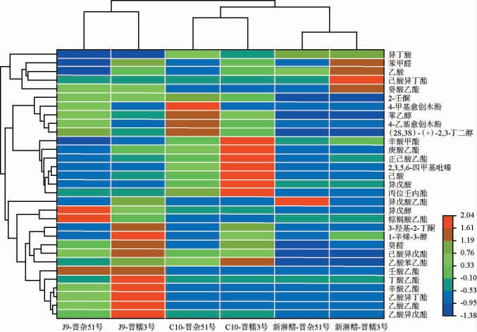 由图3可知,晋杂51号组和晋糯3号组的酒醪、醋醅和新淋醋样品在聚类分析中各聚为一支,显示出明显的品种特异性。酒精发酵结束后酒醪样品中的挥发性风味物质以酯类和醇类为主,且呈现出显著的原料品种依赖性差异。晋糯3号组酒醪中乙酸乙酯、乙酸异戊酯等典型酯类物质含量明显高于晋杂51号组,这些酯类物质主要赋予酒醪清新怡人的花果香香气[27];而晋杂51号组酒醪中则富含异戊醇、苯乙醇及(2S,3S)-(+)-2,3-丁二醇等醇类物质,其中苯乙醇作为一种重要的芳香醇,主要来源于酒精发酵过程中苯丙氨酸的微生物降解代谢途径,是酵母菌次级代谢的典型产物,该物质具有独特的丁香、蜂蜜味及浓郁的玫瑰气息,其在酒醪中的大量积累为后续食醋产品带来优雅的玫瑰香气奠定了物质基础[28]。进一步对两种高粱醋酸发酵结束后的醋醅样品进行挥发性风味物质分析,发现晋糯3号组醋醅中辛酸甲酯、庚酸乙酯、正己酸乙酯、丙位壬内酯、异戊酸、己酸等物质的含量明显较高,这些物质共同构成了其特有的酯香特征;而晋杂51号组醋醅则富含4-乙基愈创木酚等酚类物质,这类成分能够赋予醋醅独特的烟熏香和草药香[29]。 相关研究表明,粳高粱酿造的小曲白酒中酚类物质含量普遍高于糯高粱小曲白酒,而糯高粱小曲白酒中乙酸乙酯、乳酸乙酯等特征性物质的含量则显著高于粳高粱小曲白酒[30],这一发现与本研究的结果高度吻合。 最后,对两种高粱发酵新淋醋中的挥发性风味物质进行系统比较,结果显示,晋糯3号组新淋醋中己酸异丁酯的含量较为突出,而晋杂51号组新淋醋则以异戊酸乙酯的含量优势为特征。