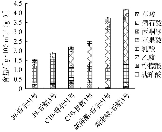 有机酸作为食醋核心风味物质,在酒精发酵阶段具有调控酸度、抑制杂菌及呈味功能,其主体积累于醋酸发酵阶段[24-25]。高粱品种对山西陈醋不同生产阶段有机酸生成的影响见图2。由图2可知,酒精发酵结束时,晋杂51号组与晋糯3号组酒醪有机酸总量分别为1.53g/100mL和1.89 g/100 mL,其中乳酸占比最高且在晋糯3号组含量较高。这是由于晋糯3号高支链淀粉结构,能被糖化酶高效水解为葡萄糖和麦芽糖,为乳杆菌属(Lactobacillus)等产酸菌提供充足碳源,乳酸积累量与乳杆菌属丰度呈显著正相关[26]。醋酸发酵结束时,晋杂51号组与晋糯3号组醋醅有机酸总量分别达2.21 g/100 g和2.48 g/100 g,乙酸和乳酸为主要成分。 在两种高粱酿造的新淋醋中,晋糯3号组有机酸总量较高(4.26 g/100 mL),相较于晋杂51号组新淋醋,有机酸总量提高20.99%,其中乙酸、乳酸和琥珀酸分别增加14.41%、47.69%、65.50%。这些有机酸分别赋予食醋刺激性酸味、酸甜味和酸咸味,显著丰富了产品风味层次。