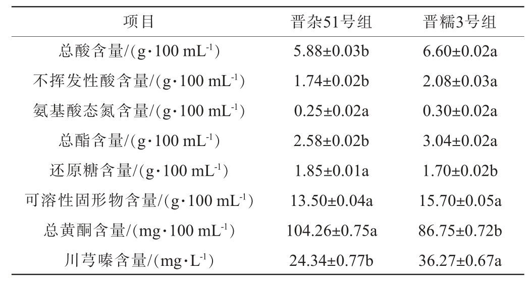 项目 晋杂51号组 晋糯3号组总酸含量/(g·100 mL-1)不挥发性酸含量/(g·100 mL-1)氨基酸态氮含量/(g·100 mL-1)总酯含量/(g·100 mL-1)还原糖含量/(g·100 mL-1)可溶性固形物含量/(g·100 mL-1)总黄酮含量/(mg·100 mL-1)川芎嗪含量/(mg·L-1)5.88±0.03b 1.74±0.02b 0.25±0.02a 2.58±0.02b 1.85±0.01a 13.50±0.04a 104.26±0.75a 24.34±0.77b 6.60±0.02a 2.08±0.03a 0.30±0.02a 3.04±0.02a 1.70±0.02b 15.70±0.05a 86.75±0.72b 36.27±0.67a