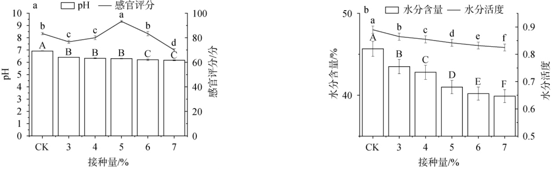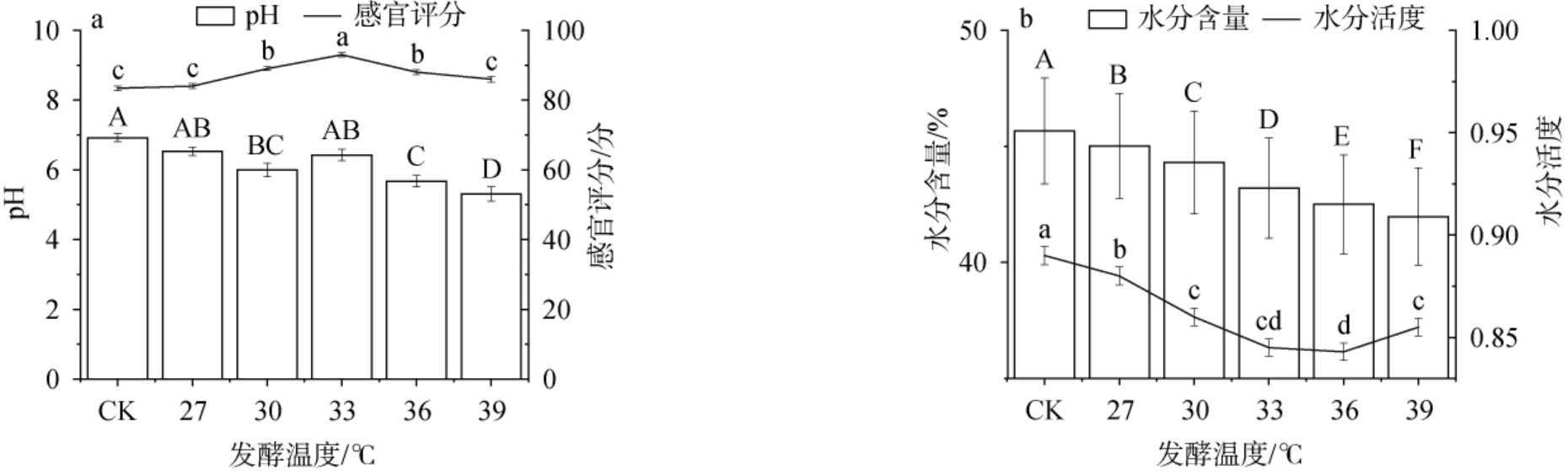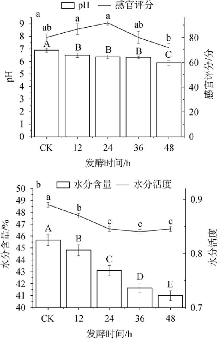 不同大写字母表示pH、水分含量差异显著(P<0.05),不同小写字母表示感官、水分活度差异显著(P<0.05)。
