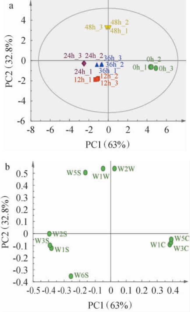 由图9a可知,第一主成分PC1和第二主成分PC2的方差贡献率分别为63.0%和32.8%,累计方差贡献率为95.8%,>85%,可以反映样品的总体风味信息。图中样品的置信分散,没有交叉,说明电子鼻可以区分不同发酵时间下发酵的牛肉干样品,不同发酵时间样品间存在明显的气味差异。