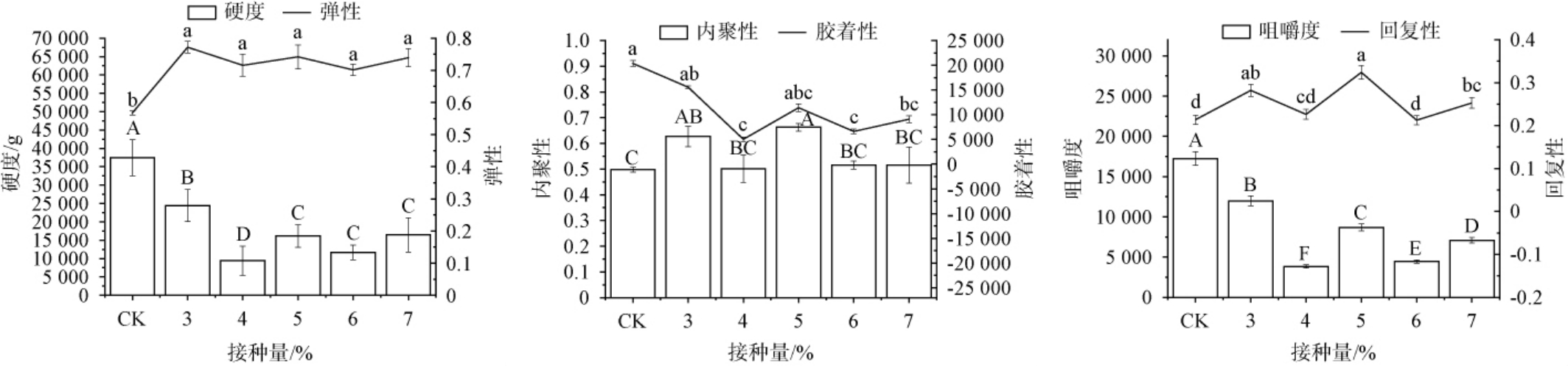 图2 不同发酵剂接种量对发酵牛肉干质构的影响