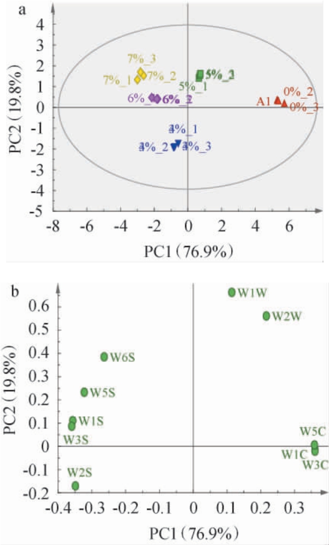 由图3a可知,第一主成分(principal component 1,PC1)和第二主成分PC2的方差贡献率分别为76.9%和19.8%,累计方差贡献率为96.7%,>85%,可以反映发酵牛肉干样品的总体风味信息。图中样品的置信分散,没有交叉,说明电子鼻响应值主成分分析可以区分不同接种量发酵的牛肉干样品,不同接种量组样品间存在明显的气味差异。
