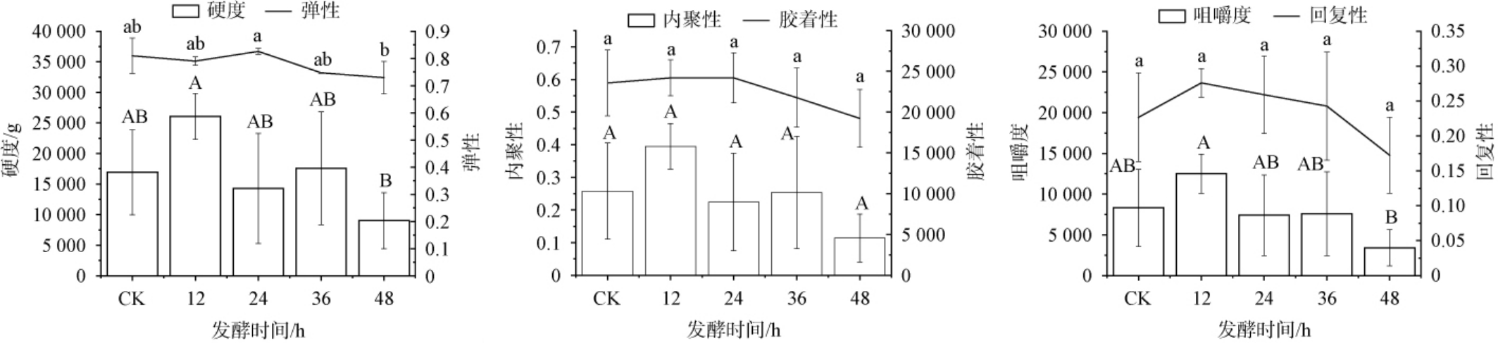 不同大写字母表示硬度、内聚性、咀嚼度差异显著(P<0.05),不同小写字母表示弹性、胶着性、回复性差异显著(P<0.05)。