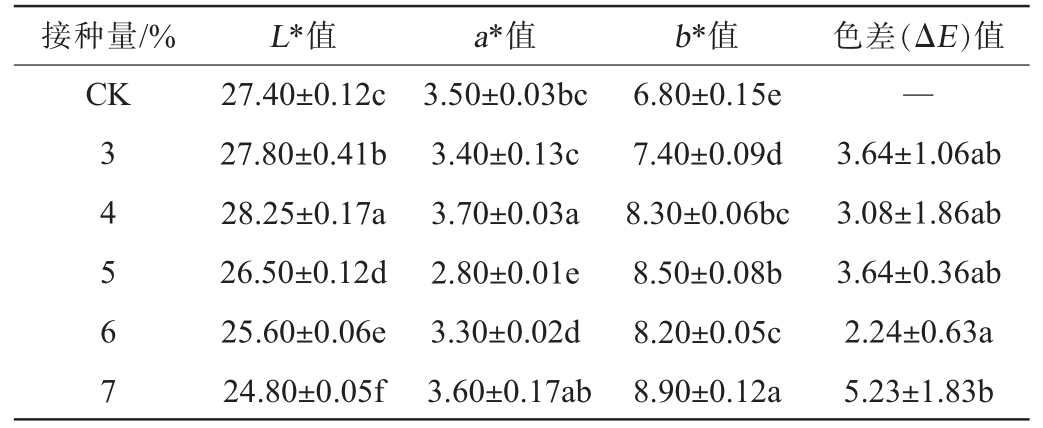 接种量/% L*值 a*值 b*值 色差(ΔE)值CK —3.64±1.06ab 3.08±1.86ab 3.64±0.36ab 2.24±0.63a 5.23±1.83b 3 4 5 6 7 27.40±0.12c 27.80±0.41b 28.25±0.17a 26.50±0.12d 25.60±0.06e 24.80±0.05f 3.50±0.03bc 3.40±0.13c 3.70±0.03a 2.80±0.01e 3.30±0.02d 3.60±0.17ab 6.80±0.15e 7.40±0.09d 8.30±0.06bc 8.50±0.08b 8.20±0.05c 8.90±0.12a
