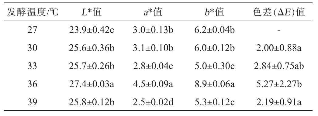 发酵温度/℃ L*值 a*值 b*值 色差(ΔE)值27 30 33 36 39 23.9±0.42c 25.6±0.36b 25.7±0.26b 27.4±0.03a 25.8±0.12b 3.0±0.13b 3.1±0.10b 2.8±0.04c 4.5±0.09a 2.5±0.02d 6.2±0.04b 6.0±0.12b 5.0±0.30c 8.9±0.06a 5.3±0.12c-2.00±0.88a 2.84±0.75ab 5.27±2.27b 2.19±0.91a
