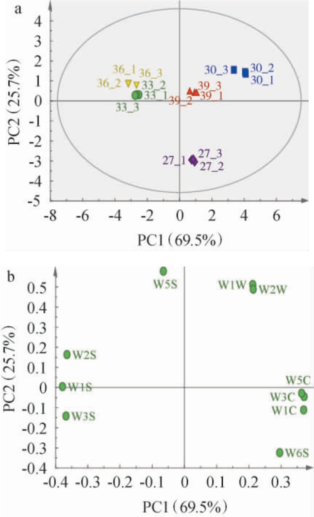 由图6a可知,第一主成分PC1的方差贡献率为69.5%,第二主成分PC2方差贡献率为25.7%,累计方差贡献率为95.2%,>85%,可以反映发酵牛肉干样品的总体风味信息。图中样品的置信分散,没有交叉,说明电子鼻响应值主成分分析可以区分不同发酵温度下发酵的牛肉干样品,不同发酵温度样品间存在明显的气味差异。