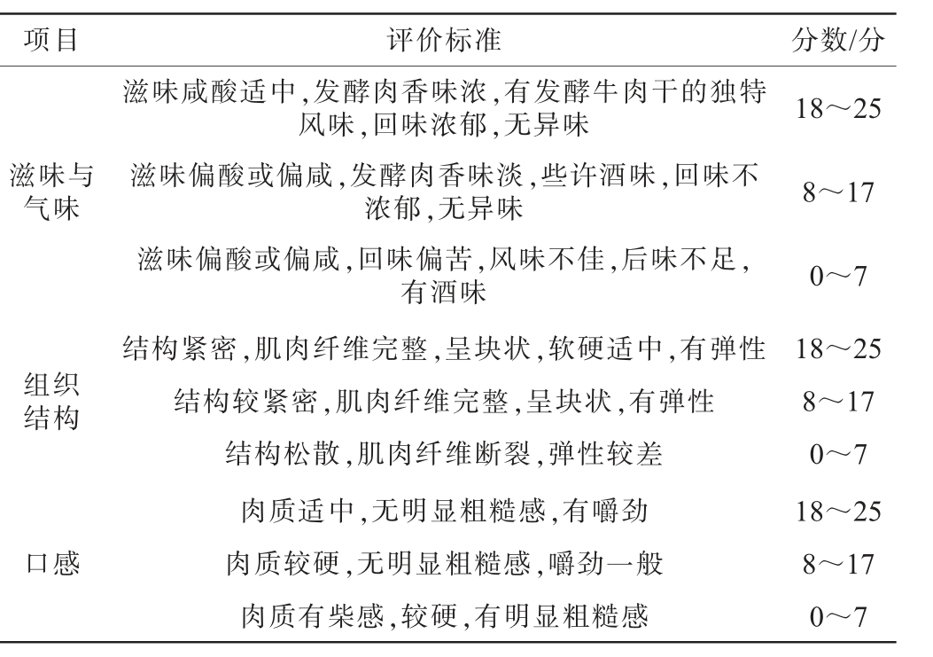 组织感官评定小组,共10人,从产品的色泽、滋味与气味、组织结构、口感4个方面,对发酵牛肉干进行感官评价,满分100分,发酵牛肉干感官评价标准见表2。