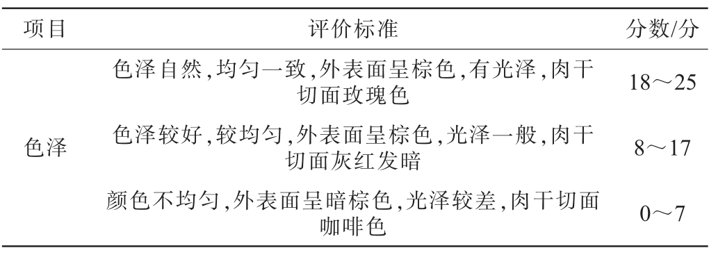 项目 评价标准 分数/分18~25色泽色泽自然,均匀一致,外表面呈棕色,有光泽,肉干切面玫瑰色色泽较好,较均匀,外表面呈棕色,光泽一般,肉干切面灰红发暗颜色不均匀,外表面呈暗棕色,光泽较差,肉干切面咖啡色8~17 0~7