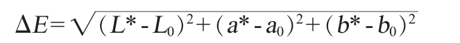 颜色参数测定[26]:L*值表示明亮度,正值表示偏白,负值表示偏暗;a*值表示红绿度,正值表示偏红,负值表示偏绿;b*值表示黄蓝度,正值表示偏黄,负值表示偏蓝;总色差(ΔE)表示颜色变化幅度,值越大越变色,越小越接近,其计算公式如下: