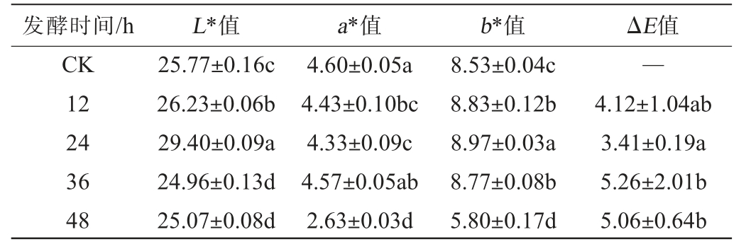 发酵时间/h L*值 a*值 b*值 ΔE值CK 12 24 36 48 25.77±0.16c 26.23±0.06b 29.40±0.09a 24.96±0.13d 25.07±0.08d 4.60±0.05a 4.43±0.10bc 4.33±0.09c 4.57±0.05ab 2.63±0.03d 8.53±0.04c 8.83±0.12b 8.97±0.03a 8.77±0.08b 5.80±0.17d—4.12±1.04ab 3.41±0.19a 5.26±2.01b 5.06±0.64b
