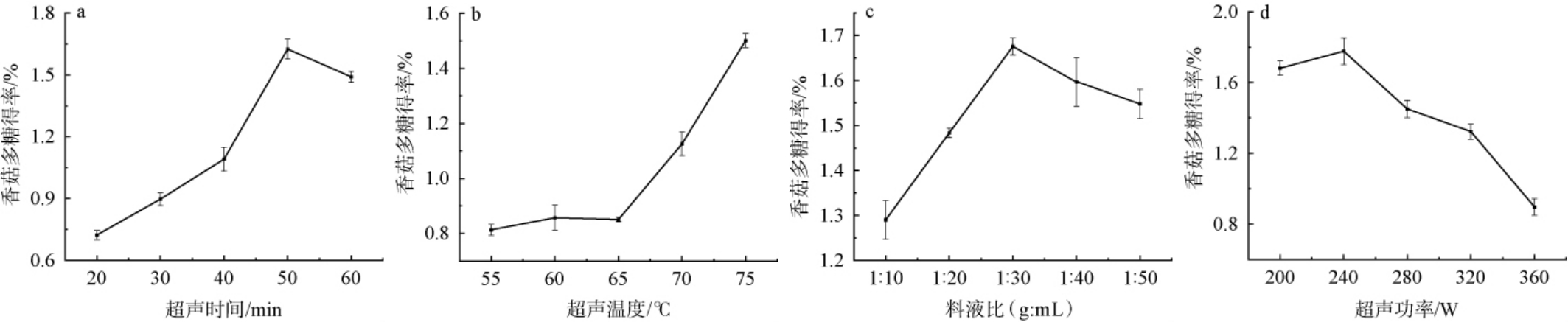 以香菇多糖得率为评价指标,探究不同超声时间、超声温度、料液比以及超声功率条件下对多糖得率的影响,单因素试验结果见图1。