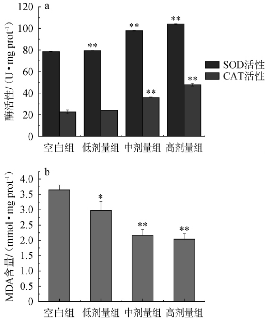 通过线虫体内实验证实,香菇多糖展现出良好的抗氧化活性,能有效提升SOD与CAT这两种抗氧化酶的酶活性,从而减轻自由基引发的脂质过氧化损伤,降低氧化产物中MDA的含量。该结果表明,香菇多糖是一种能够激活机体内在抗氧化潜能中的活性成分,在抵抗氧化应激和延缓衰老相关领域具有重要的开发潜力。