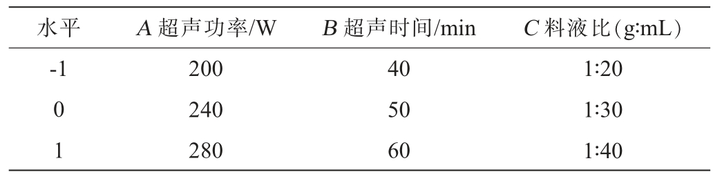 水平 A 超声功率/W B 超声时间/min C 料液比(g∶mL)-1 0 1 200 240 280 40 50 60 1∶20 1∶30 1∶40