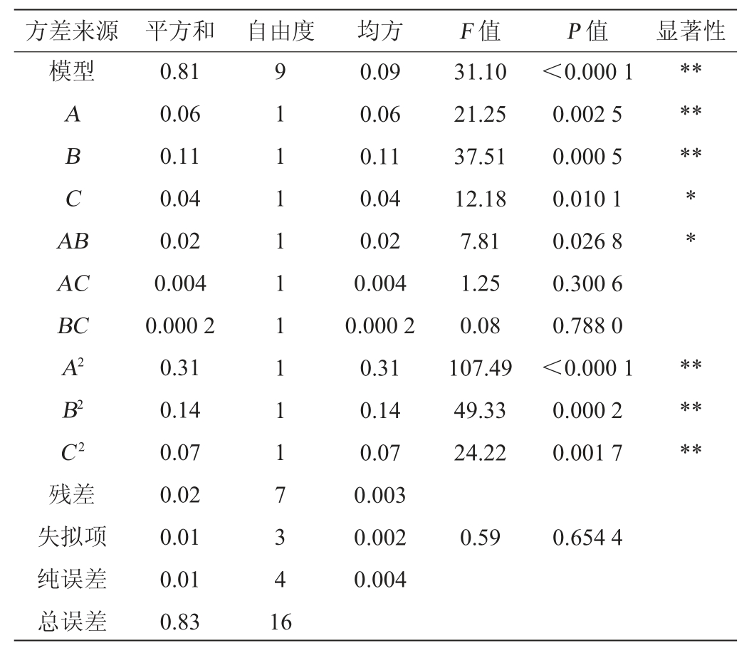 方差来源 平方和 自由度 均方 F 值 P 值 显著性模型ABCA B******AC BC A2 B2 C2残差失拟项纯误差总误差0.81 0.06 0.11 0.04 0.02 0.004 0.000 2 0.31 0.14 0.07 0.02 0.01 0.01 0.83 9 1 1 1 1 1 1 1 1 1 7 3 4 1 6 0.09 0.06 0.11 0.04 0.02 0.004 0.000 2 0.31 0.14 0.07 0.003 0.002 0.004 31.10 21.25 37.51 12.18 7.81 1.25 0.08 107.49 49.33 24.22<0.000 1 0.002 5 0.000 5 0.010 1 0.026 8 0.300 6 0.788 0<0.000 1 0.000 2 0.001 7** ******0.59 0.654 4