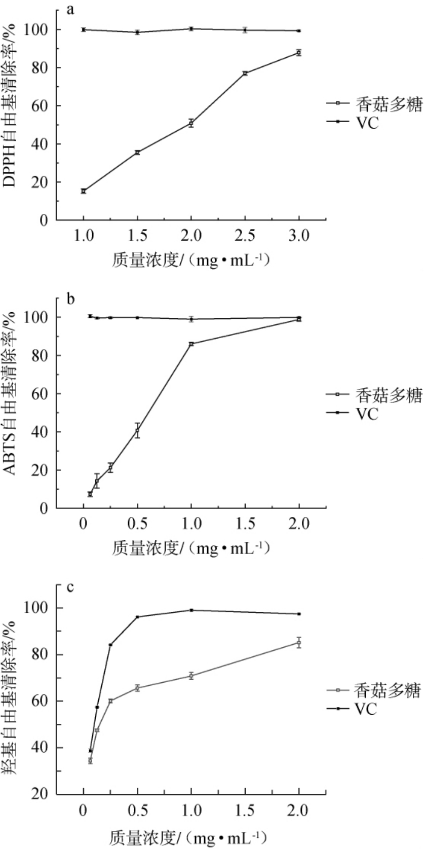 由图3b可知,香菇多糖质量浓度在0.0625~2.0000mg/mL的范围内与ABTS自由基清除率呈现良好的量效关系,其自由基清除能力随浓度递增而明显增强。当香菇多糖质量浓度为2 mg/mL时,ABTS自由基清除率最高,为98.79%,IC50值为0.58 mg/mL,表明其对ABTS自由基具有极强的清除能力。