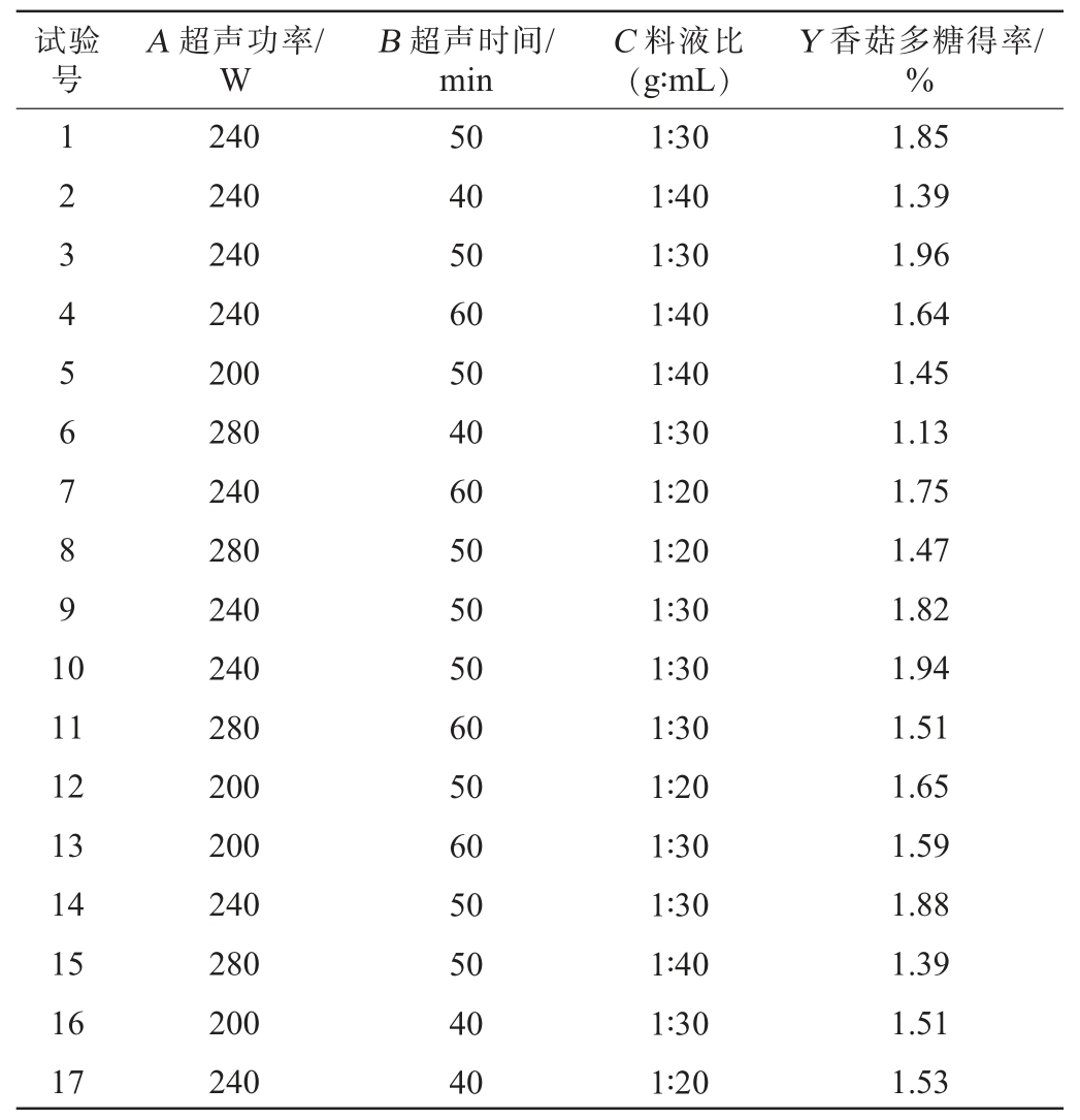 试验号A 超声功率/W B 超声时间/min C 料液比(g∶mL)Y 香菇多糖得率/%1234567891 0 11 12 13 14 15 16 17 240 240 240 240 200 280 240 280 240 240 280 200 200 240 280 200 240 50 40 50 60 50 40 60 50 50 50 60 50 60 50 50 40 40 1∶30 1∶40 1∶30 1∶40 1∶40 1∶30 1∶20 1∶20 1∶30 1∶30 1∶30 1∶20 1∶30 1∶30 1∶40 1∶30 1∶20 1.85 1.39 1.96 1.64 1.45 1.13 1.75 1.47 1.82 1.94 1.51 1.65 1.59 1.88 1.39 1.51 1.53