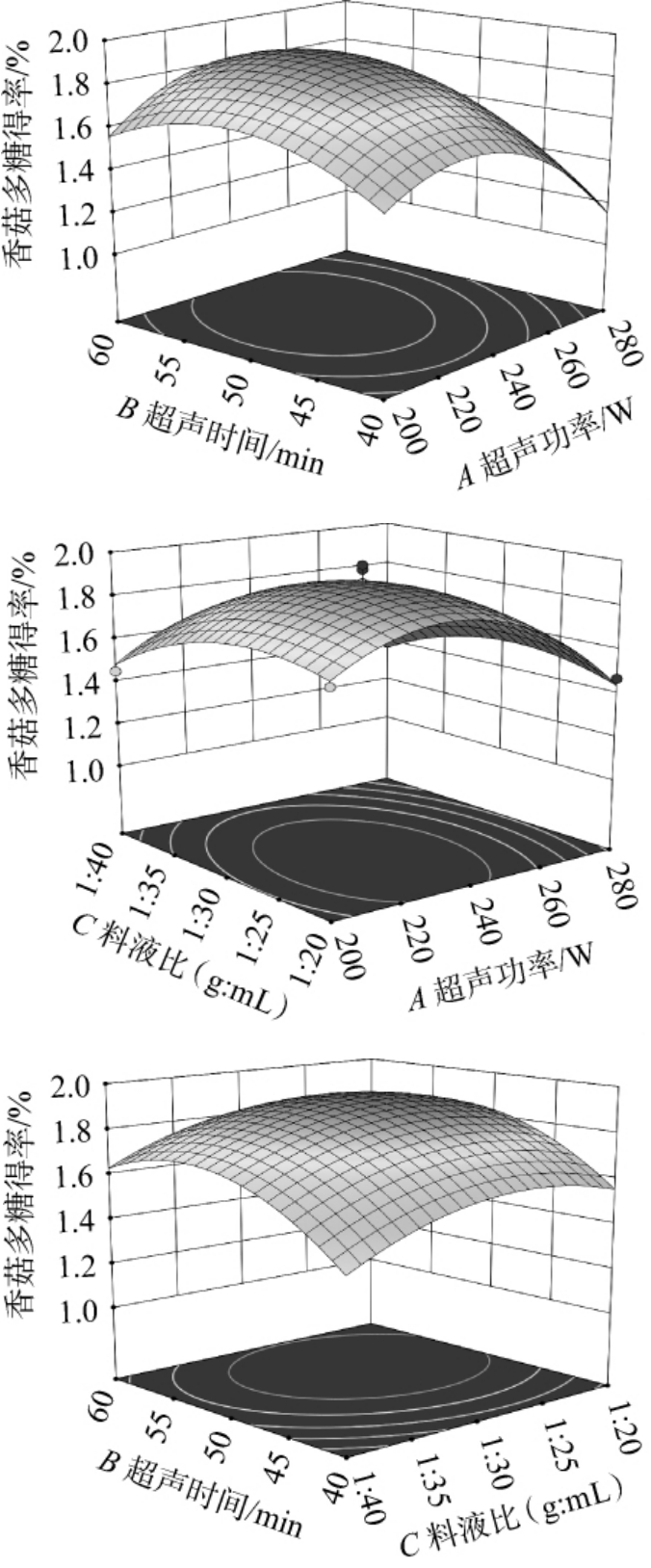 由表3可知,模型P值<0.000 1,极显著;失拟项P值为0.654 4,不显著,表明模型高度拟合,可信度较高。决定系数R2和调整决定系数R2Adj分别为0.975 6和0.944 2,表明模型可靠。由P值可知,一次项A、B,二次项A2、B2、C2对结果影响极显著(P<0.01);一次项C及交互项AB对结果影响显著(P<0.05),其他项不显著(P>0.05)。由F值可知,各因素对香菇多糖得率影响大小依次为超声时间(B)>超声功率(A)>料液比(C)。