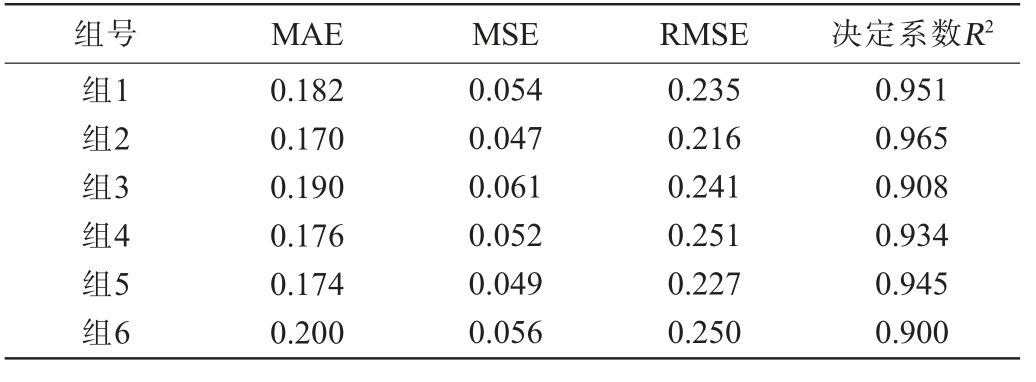组号 MAE MSE RMSE 决定系数R2组1组2组3组4组5组6 0.182 0.170 0.190 0.176 0.174 0.200 0.054 0.047 0.061 0.052 0.049 0.056 0.235 0.216 0.241 0.251 0.227 0.250 0.951 0.965 0.908 0.934 0.945 0.900