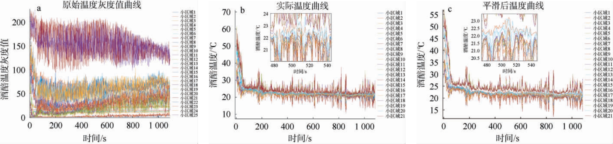 Fig.4 Gray scale values of temperature for fermented grains in different small regions (a) and actual fermented grain temperature curves before (b) and after (c) exponentially weighted moving average algorithm preprocessing