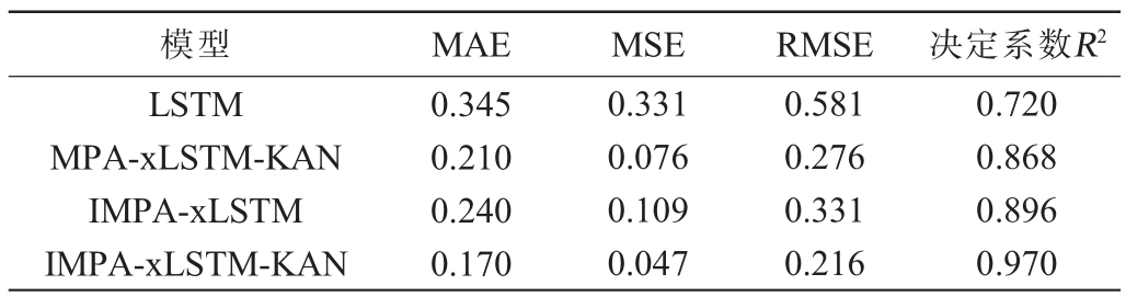 由表3可知,LSTM模型相较其他模型预测能力较差,而IMPA-xLSTM-KAN的MAE、MSE、RMSE和决定系数R2均达到最佳。 结果表明,IMPA-xLSTM-KAN模型具有较好预测酒醅温度的能力,其IMPA算法的搜索能力强于MPA算法,xLSTM-KAN也能够较好的提取温度数据信息。