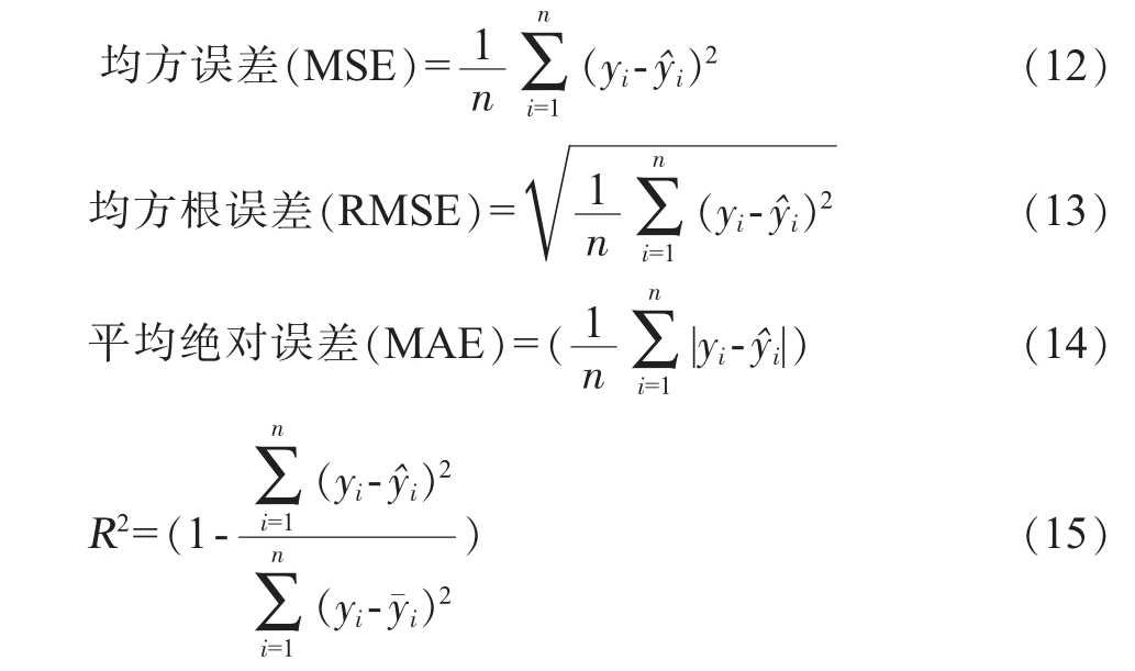 式中:n表示数据点的数量,y¯为实际值的均值,yi 为实际值,y^i为预测值。均方误差、均方根误差和平均绝对误差越低,说明模型的预测精度越高;R2衡量模型解释实际数据变动的能力,R2值越高,说明模型对数据的解释力越强[24]。