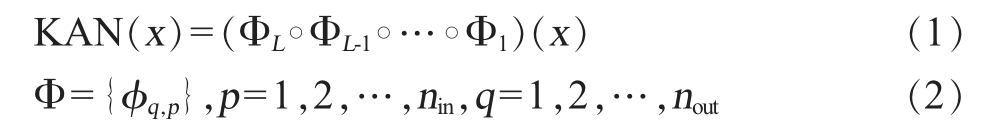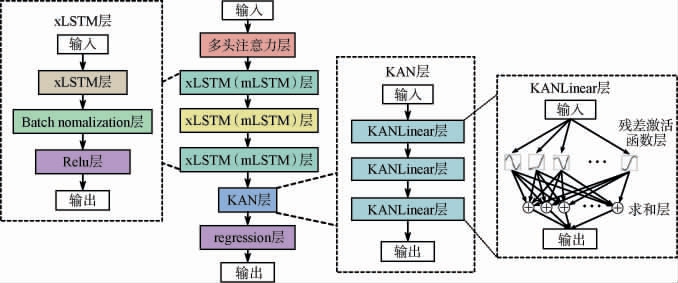 xLSTM-KAN模型的结构见图2,其包含3层xLSTM结构,每个xLSTM层操作后,模型都执行批量归一化(Batch nomalization)并使用Relu激活函数[17]。 使用KAN神经网络对全连接层进行改进,传统的全连接层采用多层感知器(multilayer perceptron,MLP)结构,而MLP的参数数量庞大,增加了训练的计算量,且由于激活函数固定,可能出现梯度消失或梯度爆炸的问题,而KAN结构相对于MLP结构而言,使用更少的参数解决了更加深层的问题,并且拥有更好的解释性[18],一个KANLinear层的KAN可以表示为: