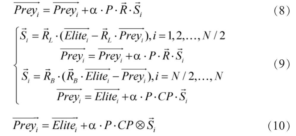 式中:N为捕食者个体数,D为维度。当出现更强的捕食者时,其将取代原有顶级捕食者,并更新Elite矩阵。同时,另一个同样大小的Prey矩阵用于捕食者位置更新。优化过程根据捕食者和猎物的速度比分为高速比、等速比和低速比三个阶段,使用布朗运动、莱维飞行作为最佳觅食策略。集鱼装置(fish aggregating devices,FADs)效应使其在不同维度上进行更长时间的跳跃,以寻找新的猎物分布。