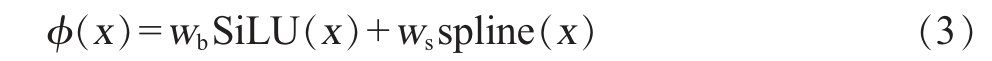 式中:wb和ws为两个可学习的权重参数,SiLU(x)表示Sigmoid线性单元(Sigmoid linear unit)激活函数[19],spline(x)则为三阶均匀B样条函数B(x)和可学习的权重参数ci 的线性组合,即: