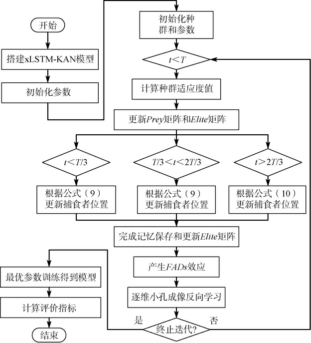 酒醅温度预测本质仍属于时间序列预测问题,在现有研究中,赵彬等[7]将长短期记忆网络(long short-term memory,LSTM)与卷积神经网络(convolutional neural network,CNN)结合,利用CNN的特征提取能力和LSTM的时序建模能力,以增强预测的准确性和鲁棒性,但预测速度无法满足工业要求;王瑞峰等[8]通过两个处理数据相反的LSTM构成双向长短期记忆网络(bi-derictional long short-term memory,BiLSTM),提高了考虑前后依赖关系的能力,在许多时序预测任务中显著提高预测的准确性,但在长时序建模中易出现梯度弥散;ALHARTHI M等[9]通过优化LSTM的门控机制和更深层次的网络堆叠实现扩展长短期记忆网络(extended long short-term memory network,xLSTM),在长依赖问题上表现更佳,但其内部非线性激活函数和线性变换组合,难以充分预测酒醅温度变化过程中复杂的非线性、非稳态动态特性;GUO S Y等[10]将循环神经网络(recurrent neural network,RNN)与科尔莫格罗夫-阿诺德网络(Kolmogorov-Arnold network,KAN)的组合,基于热力循环的组分模型进行序列耦合,从而实现多步状态预测;针对参数优化问题,PAN W T[11]根据观察的果蝇觅食行为,提出果蝇优化算法(fruit fly optimization algorithm,FFO),其是一种比较新颖的群智算法,并在全局优化方面有很好的应用效果;海洋捕食者算法(marine predators algorithm,MPA)被广泛应用于各种领域[12-13],其相较于遗传算法、粒子群算法、蚁群算法及麻雀算法等其他智能算法有着更好的全局寻优效果,适用于对超参数进行优化[14],但在超参数搜索中易陷入局部最优或收敛速度不足。