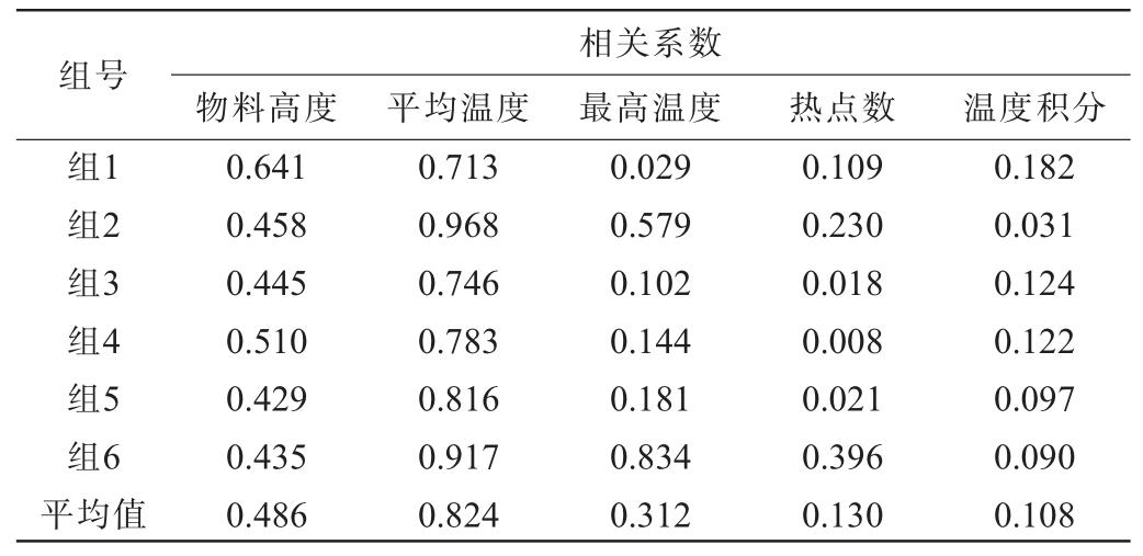 组号组1组2组3组4组5组6平均值物料高度 平均温度相关系数最高温度 热点数 温度积分0.641 0.458 0.445 0.510 0.429 0.435 0.486 0.713 0.968 0.746 0.783 0.816 0.917 0.824 0.029 0.579 0.102 0.144 0.181 0.834 0.312 0.109 0.230 0.018 0.008 0.021 0.396 0.130 0.182 0.031 0.124 0.122 0.097 0.090 0.108