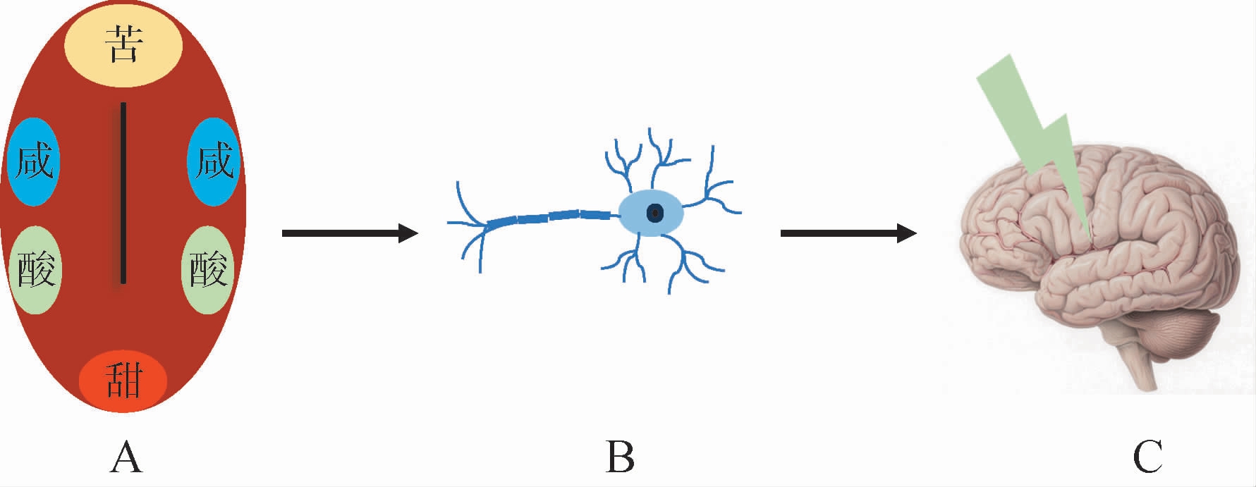 A:滋味物质与受体结合;B:神经纤维通过级联反应将兴奋信号传递到皮下中心;C:大脑皮层将信号进行整合,形成味觉。