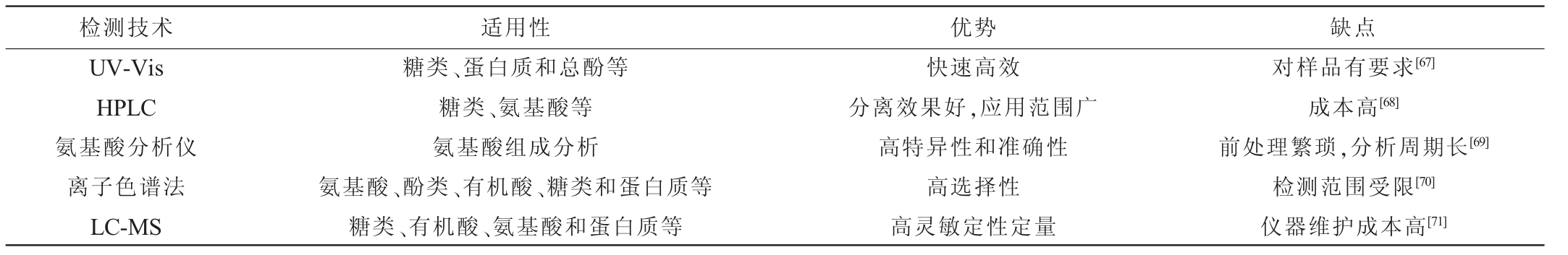检测技术 适用性 优势 缺点UV-Vis HPLC氨基酸分析仪离子色谱法LC-MS糖类、蛋白质和总酚等糖类、氨基酸等氨基酸组成分析氨基酸、酚类、有机酸、糖类和蛋白质等糖类、有机酸、氨基酸和蛋白质等快速高效分离效果好,应用范围广高特异性和准确性高选择性高灵敏定性定量对样品有要求[67]成本高[68]前处理繁琐,分析周期长[69]检测范围受限[70]仪器维护成本高[71]