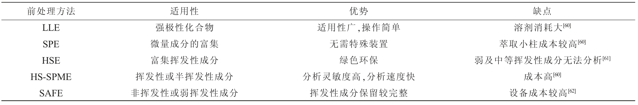 前处理方法 适用性 优势 缺点LLE SPE HSE HS-SPME SAFE强极性化合物微量成分的富集富集挥发性成分挥发性或半挥发性成分非挥发性或弱挥发性成分适用性广,操作简单无需特殊装置绿色环保分析灵敏度高,分析速度快挥发性成分保留较完整溶剂消耗大[60]萃取小柱成本较高[60]弱及中等挥发性成分无法分析[61]成本高[60]设备成本较高[62]