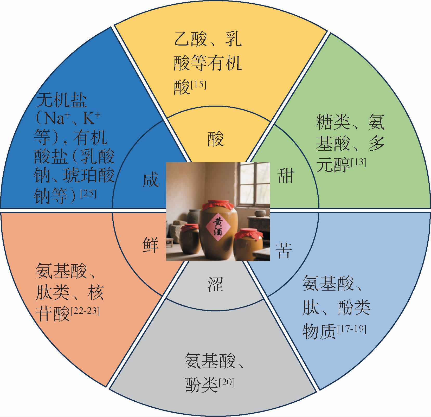 根据黄酒风味轮,黄酒的滋味可以被描述为酸味、甜味、苦味、涩味、鲜味和咸味[12],其与滋味物质之间的关系见图1。