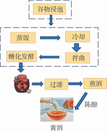 黄酒是中国的传统发酵酒,具有五千多年的历史,与啤酒和葡萄酒并称世界三大古酒[1]。其是以稻米、黍米等谷物为原料,经蒸煮、加曲、糖化、发酵、压榨、过滤、杀菌、陈酿而成的发酵酒,酒精度一般在14%vol~20%vol之间[2],其发酵工艺流程如下: