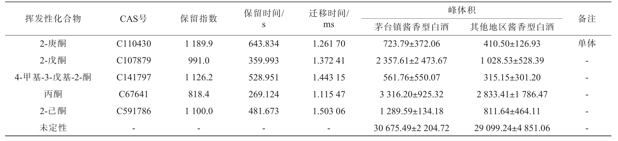 挥发性化合物 CAS号 保留指数 保留时间/s峰体积茅台镇酱香型白酒 其他地区酱香型白酒迁移时间/ms 备注2-庚酮2-戊酮4-甲基-3-戊基-2-酮丙酮2-己酮未定性C110430 C107879 C141797 C67641 C591786-1 189.9 991.0 1 126.2 818.4 1 100.0-643.834 359.993 528.951 269.124 481.673-1.261 70 1.372 41 1.443 15 1.115 47 1.503 06-723.79±372.06 2 357.61±2 473.67 561.76±550.07 3 316.20±925.32 1 289.59±134.18 30 675.49±2 204.72 410.50±126.93 1 028.53±528.39 315.15±301.20 2 833.41±1 786.47 811.64±464.11 29 099.24±4 851.06单体-- - - -